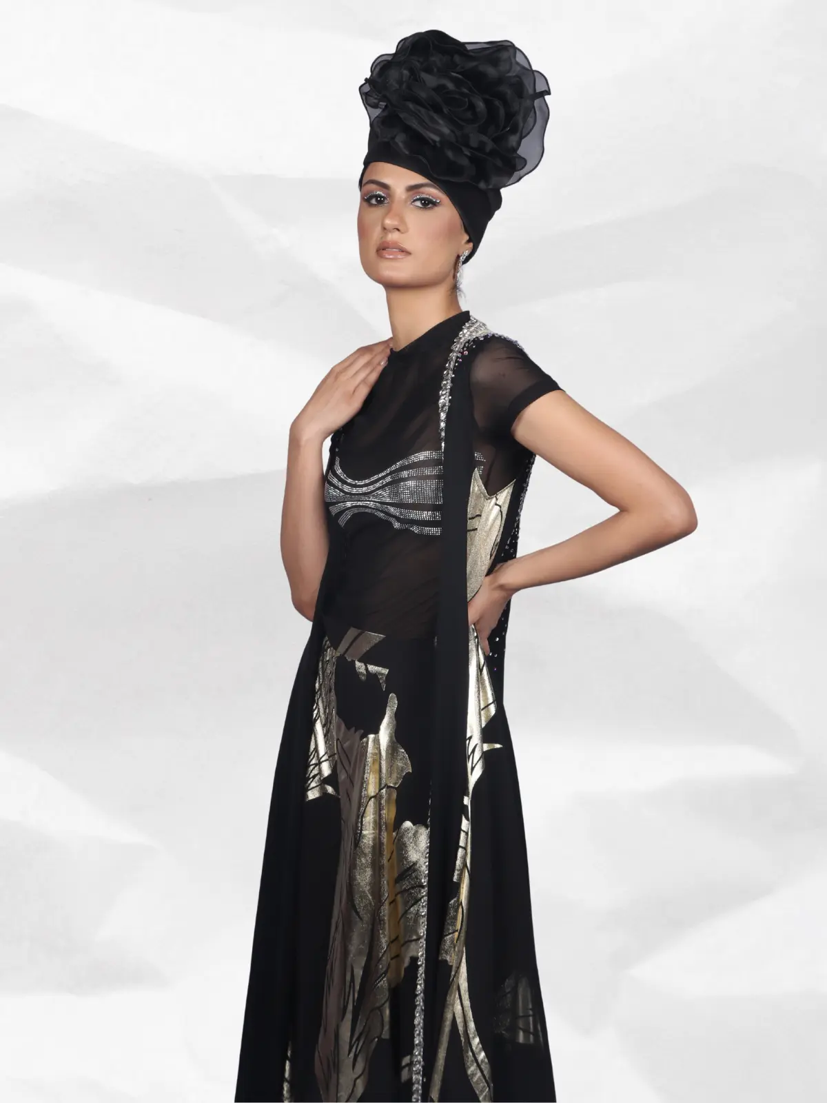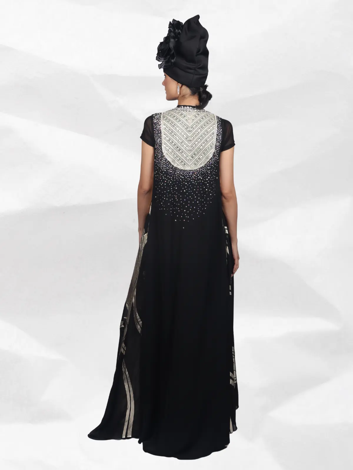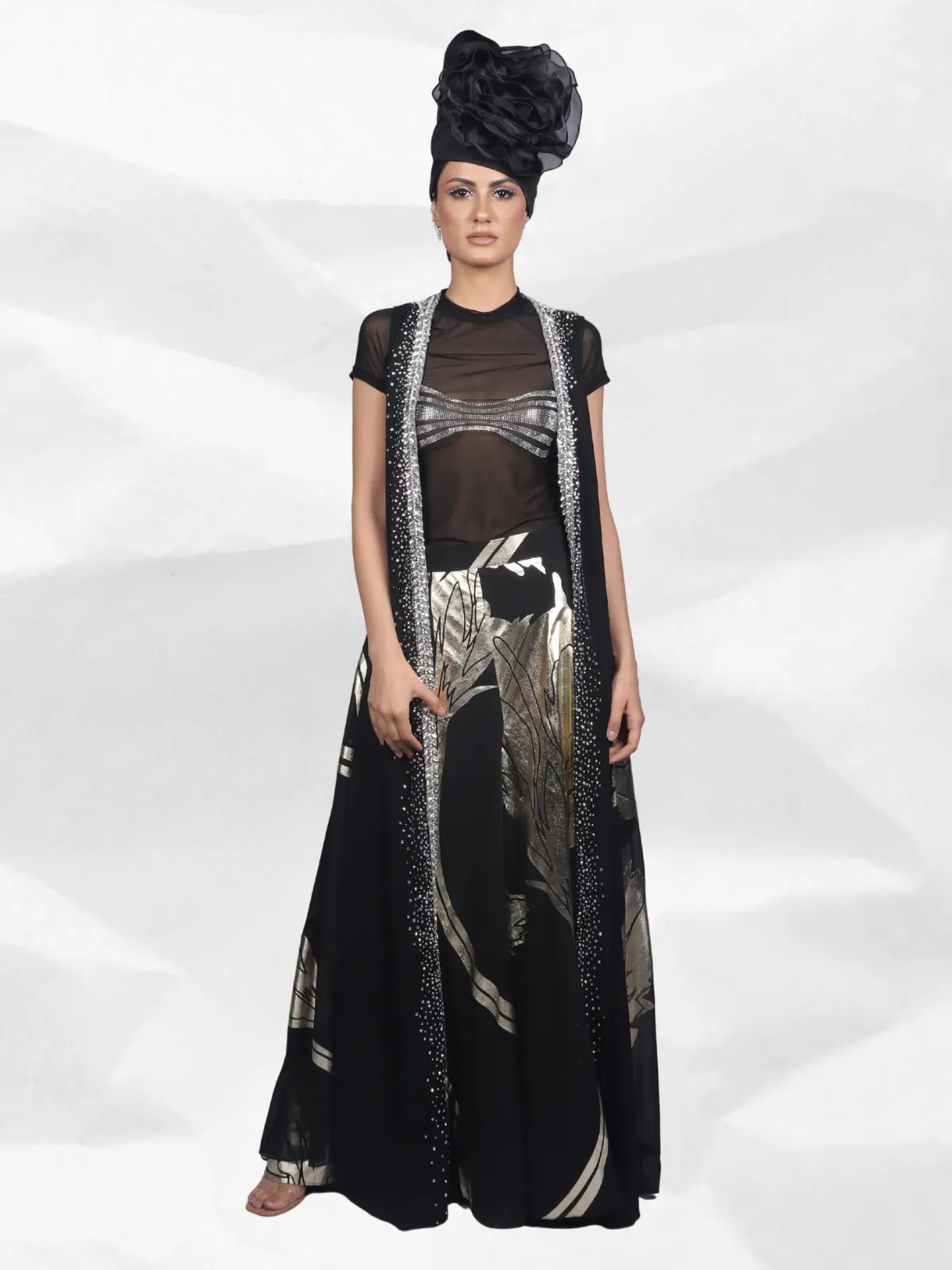 In timeless black and silver French chiffon, this Rohit Verma ensemble features long divided culottes with a crystal transparent top, layered under a flowing crystal-embellished cape. Crafted with shimmering foil work, it offers a statement silhouette perfect for red-carpet moments or luxe celebrations.