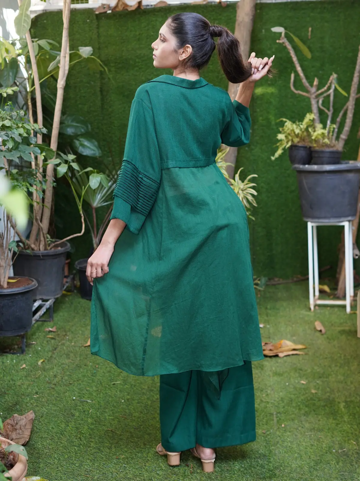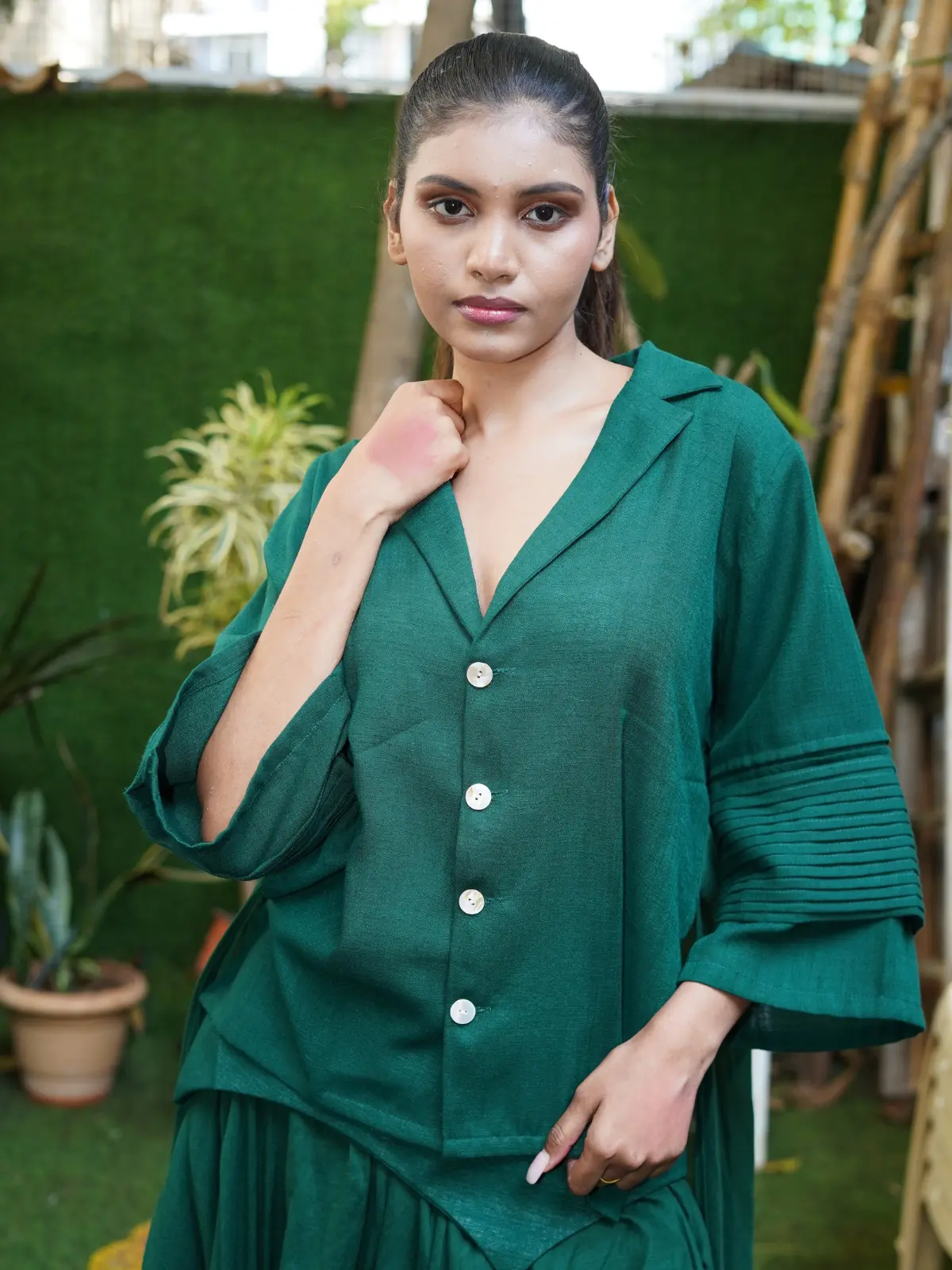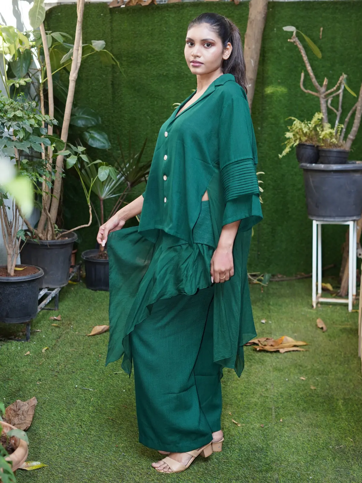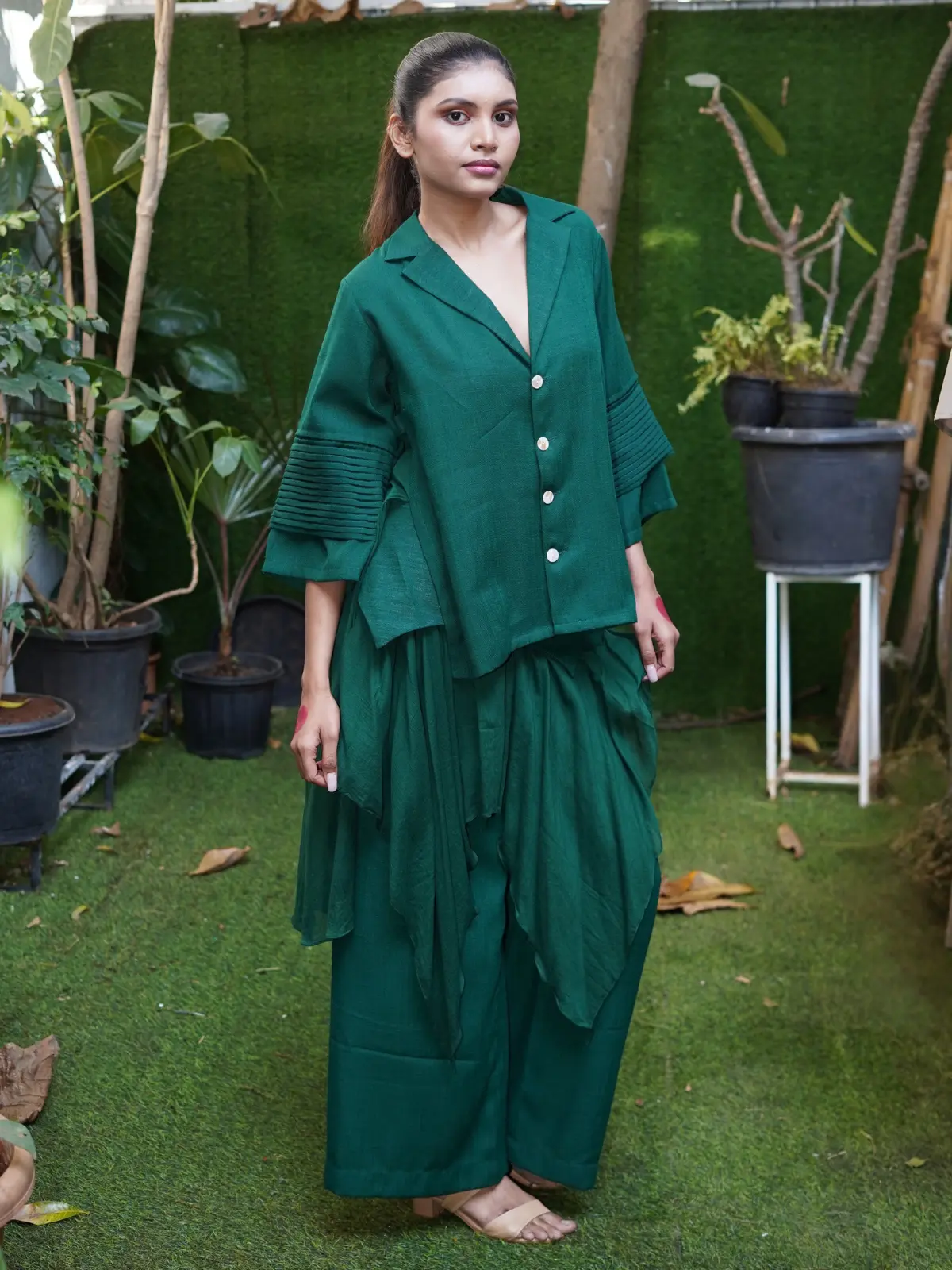 A 2-piece soft linen co-ord in rich emerald tones, featuring fluid drapes and a relaxed silhouette. The design offers both structure and movement. A bold yet wearable piece by Rohit Verma.