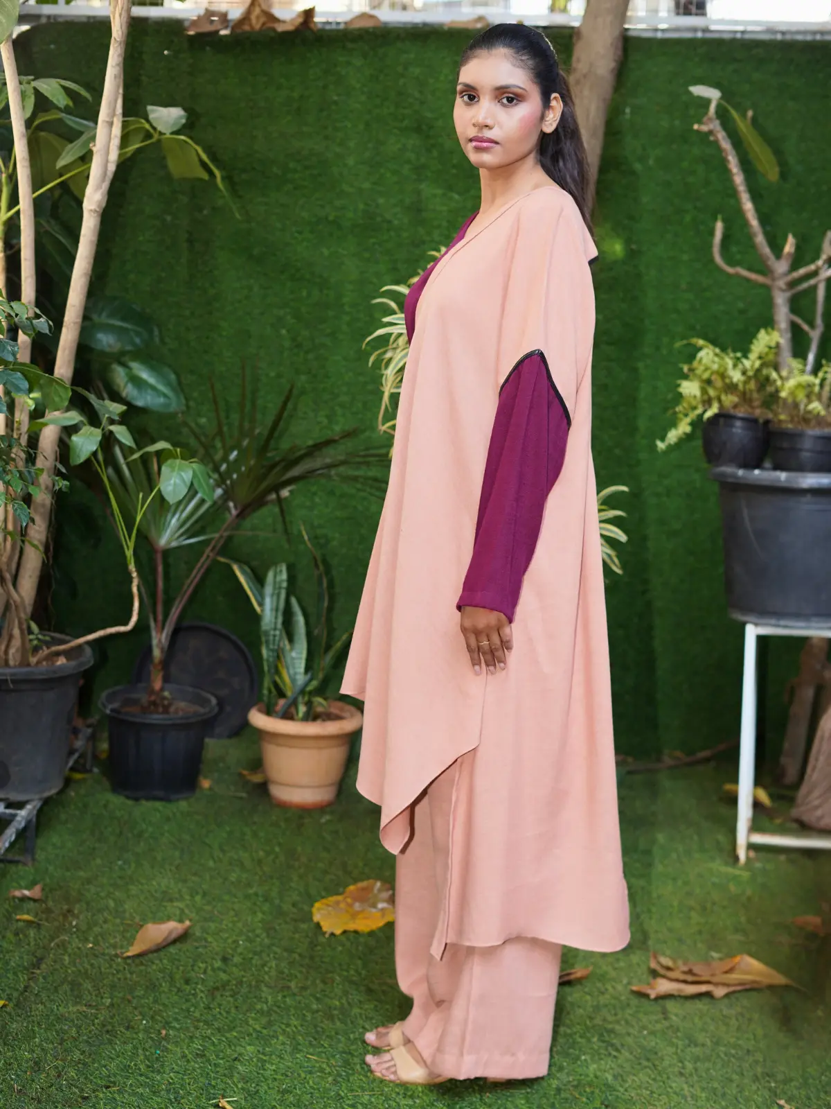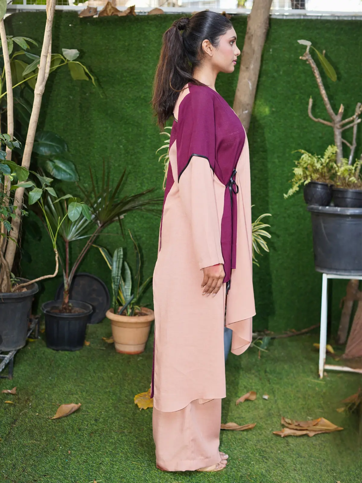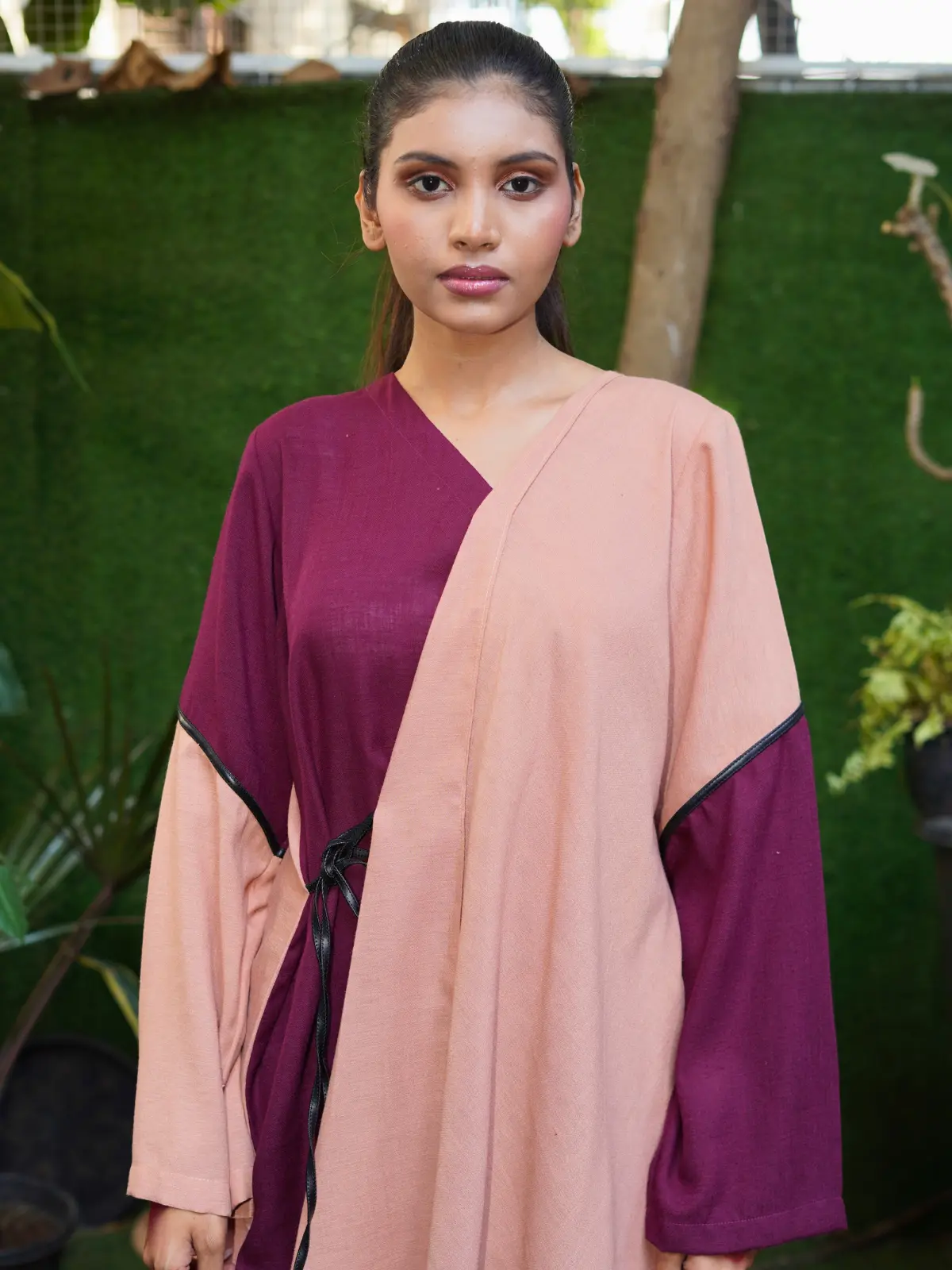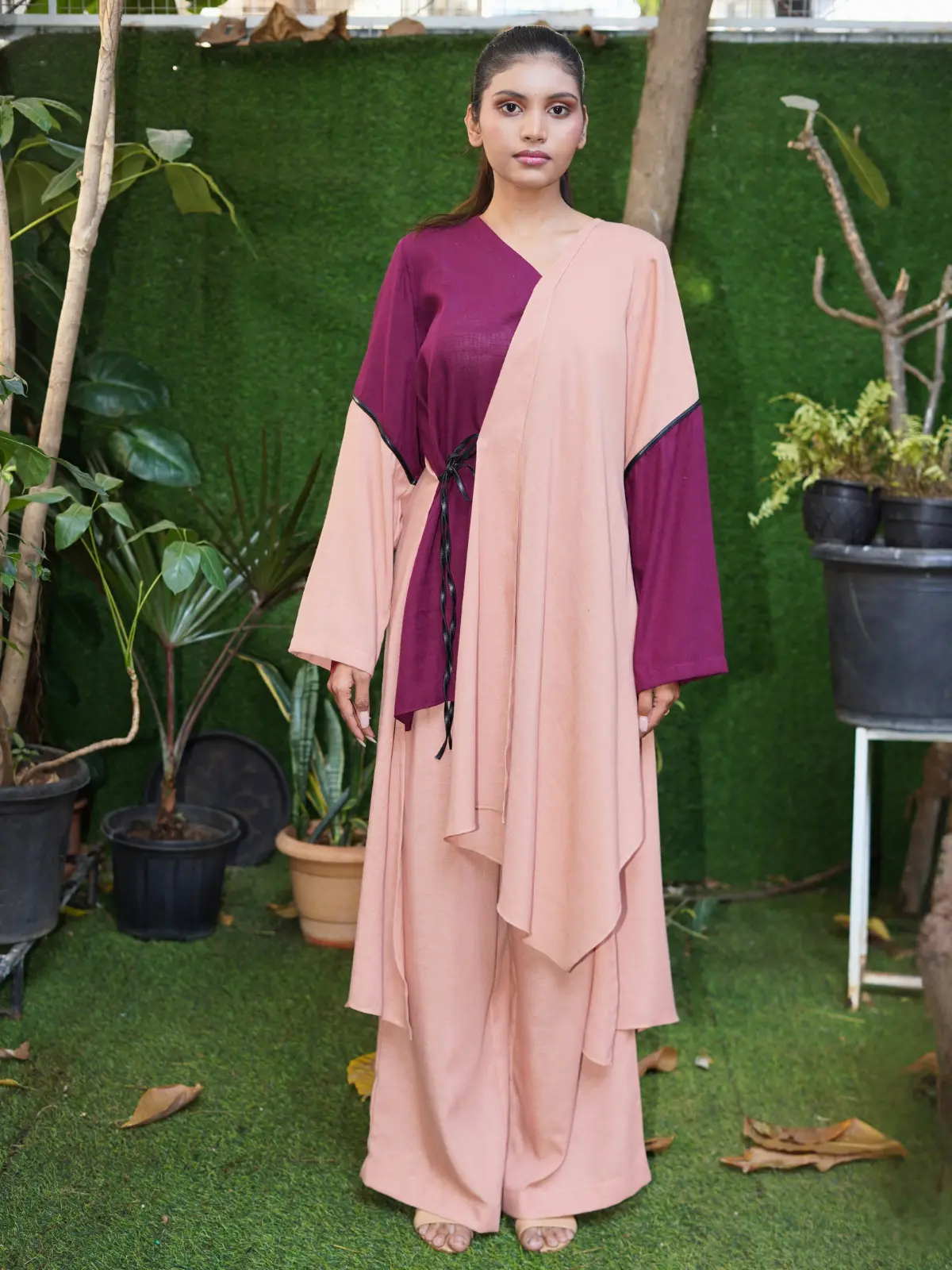 A 2-piece soft linen ensemble combining dual tones in a layered, flowing structure. The design celebrates balance between contrast and harmony. A refined creation by Rohit Verma.