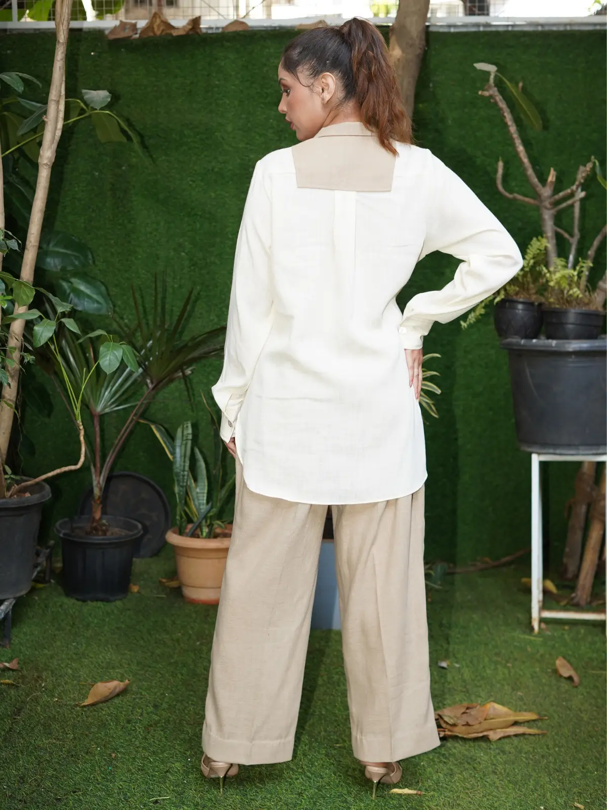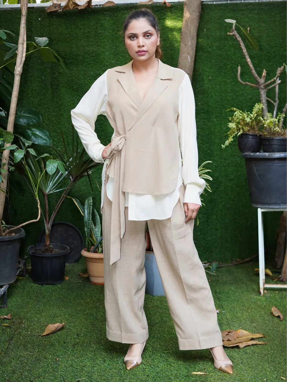 A 2-piece soft linen co-ord in warm sand tones, featuring a wrap-style silhouette. It offers a balance of structure and relaxed comfort. Crafted with intention by Rohit Verma.